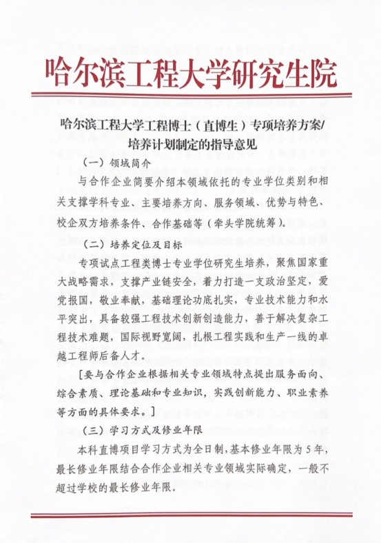 哈尔滨工程大学工程博士(直博生)专项培养方案/培养计划制定的指导意见